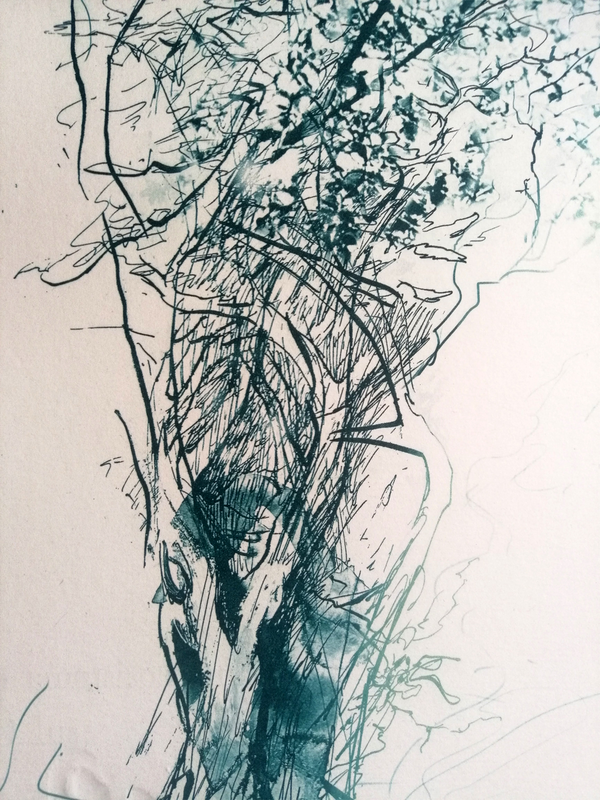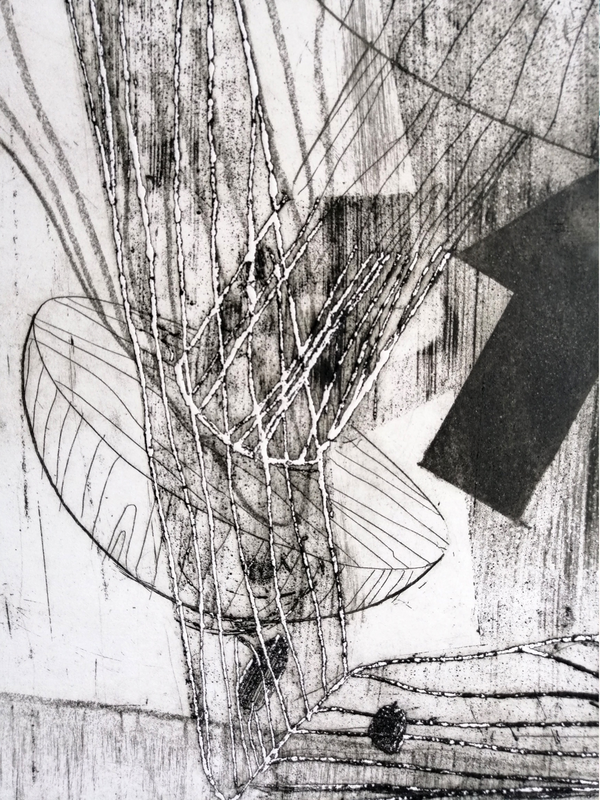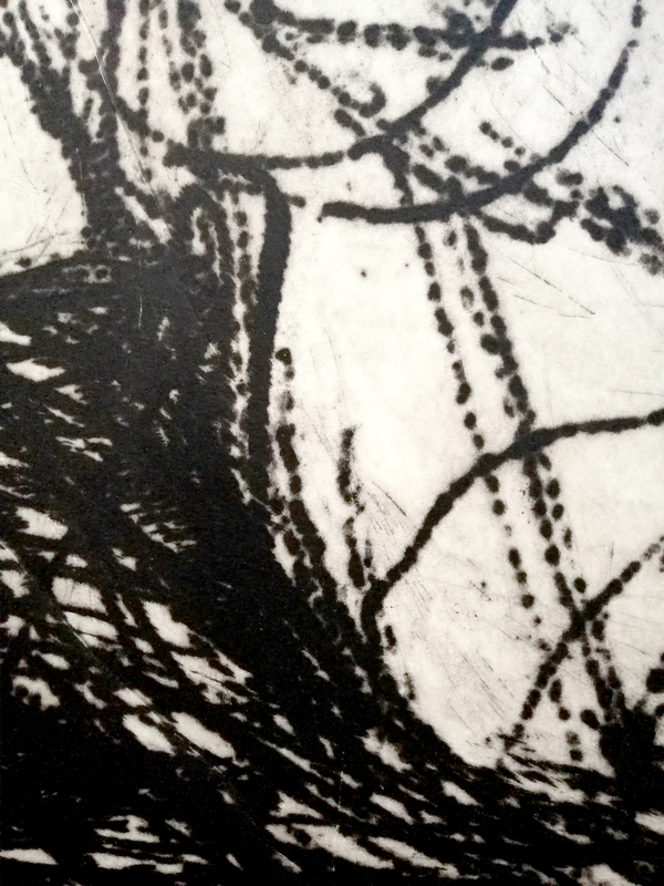 Se l’esigenza è di ottenere segni più marcati e corposi, può essere efficace incidere su zinco, dove l’azione dell’acido nitrico permette di rompere con più facilità gli argini del segno. Qui la pulitura a garza della matrice ha permesso inoltre di fondere segno e fondo, mantenendo un sapore più vellutato e meno contrastato.