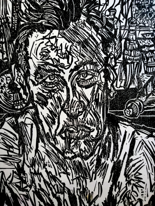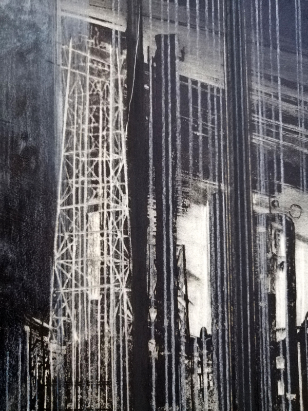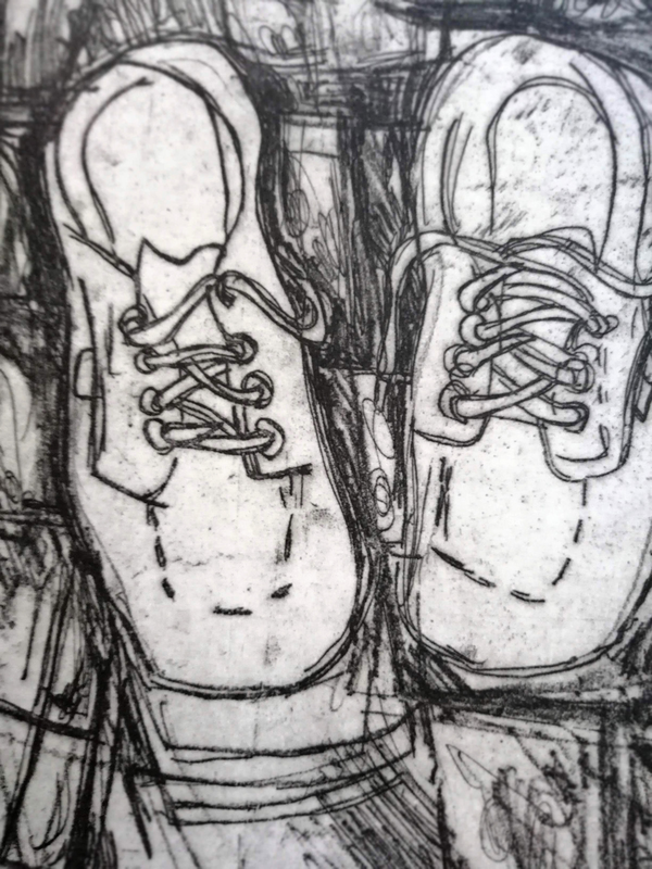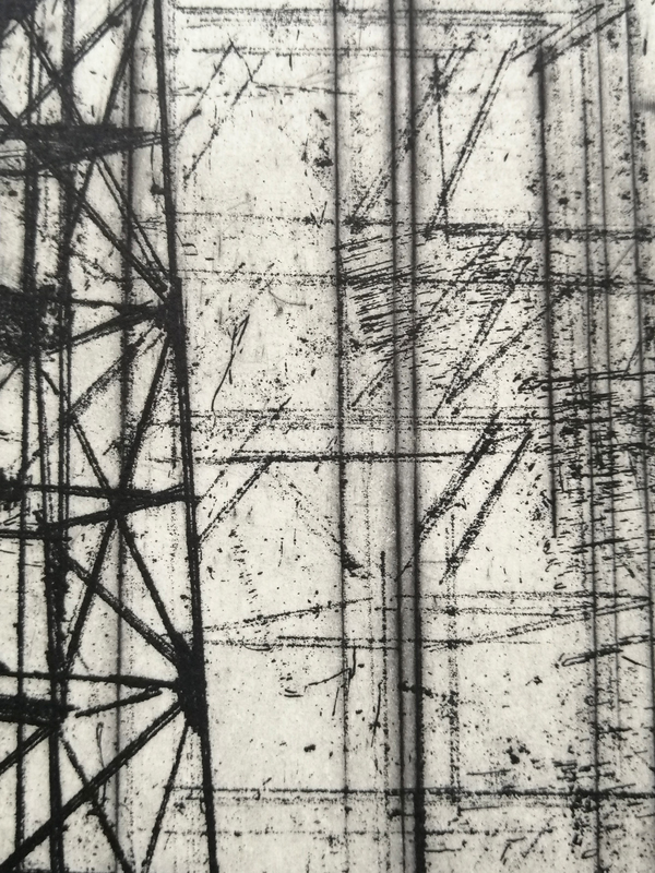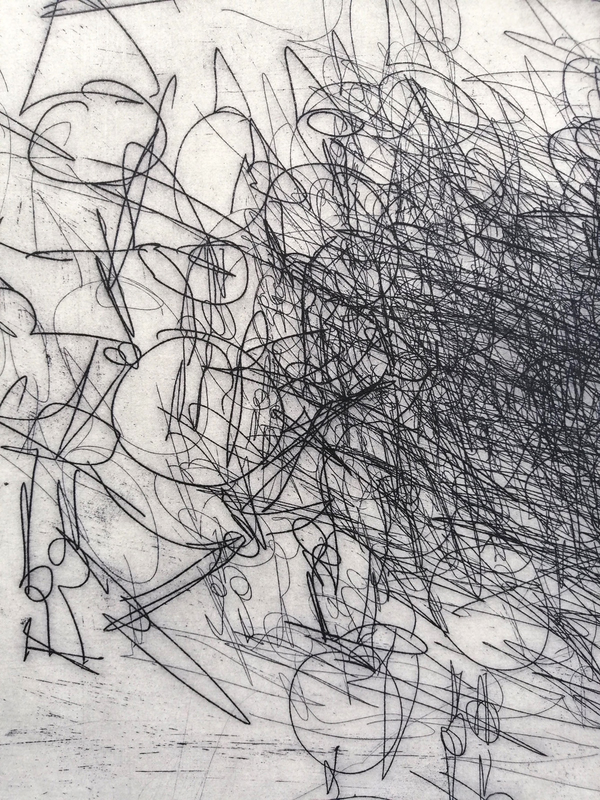 Intervenire direttamente su una matrice significa anche poter fissare su una superficie un movimento velocemente, senza esitazioni o possibilità di ripensamento. L’artista ha deciso di usare un saldatore a elettrodi per ferro direttamente sulla matrice di rame, unendo un supporto nobile della tradizione a strumenti moderni. Gli elettrodi si consumano, depositando gocce e schizzi di ferro che si fondono alla superficie; ma la lentezza della saldatura non riesce ad assecondare la velocità del gesto. Il segno è quindi a singhiozzo, intermittente, su un fondo graffiato e non lucidato, che raccolto grazie a una pulitura a garza crea un tappeto sonoro all’immagine figurativa.