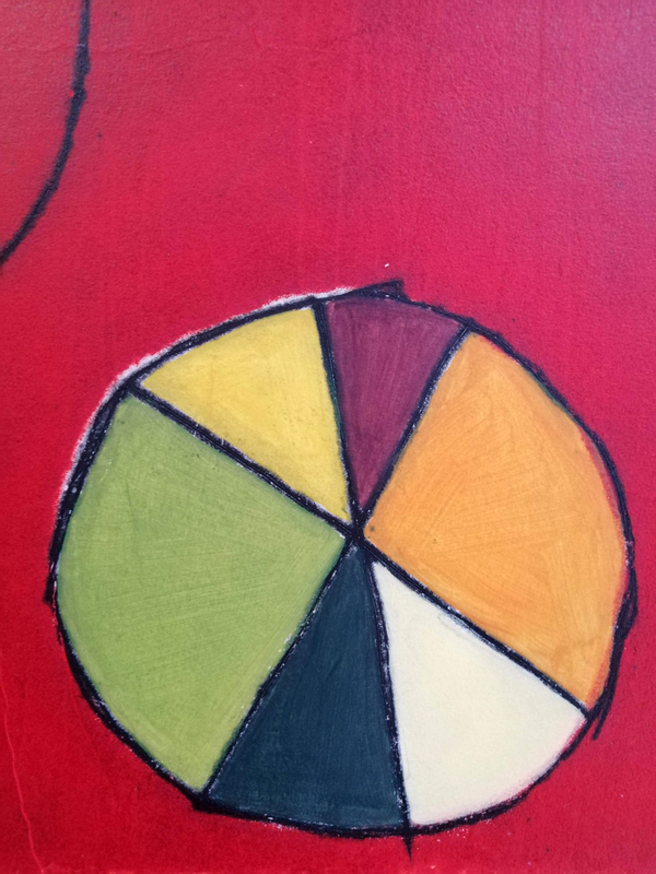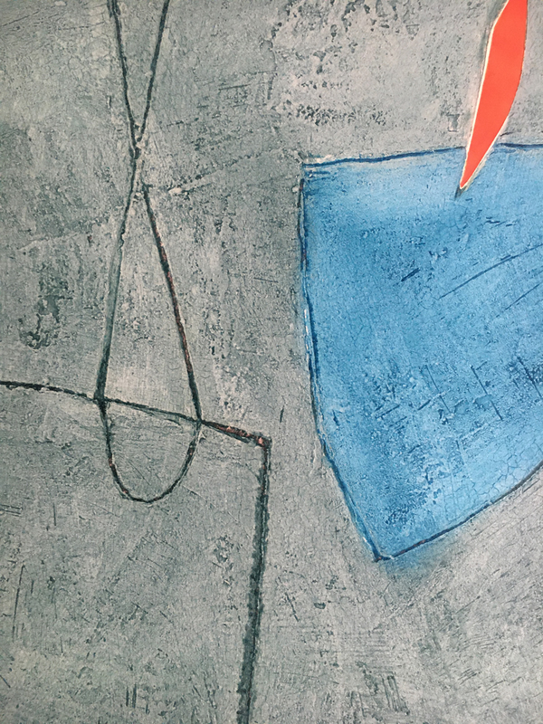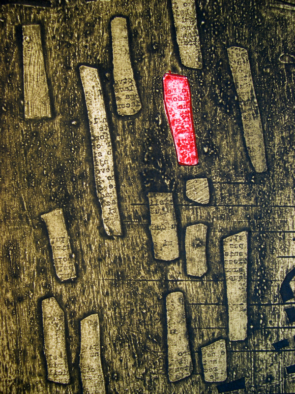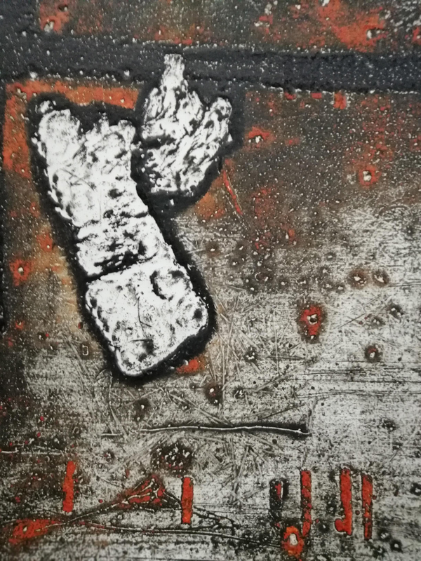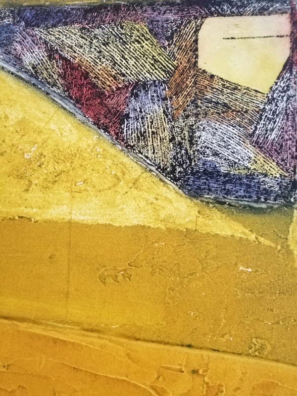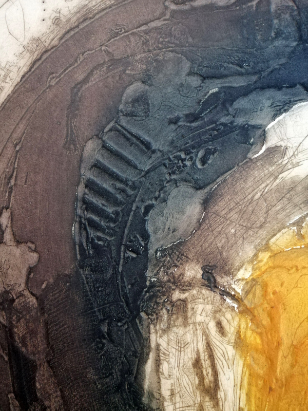 Si possono creare immagini pittoriche e materiche al tempo stesso, depositando paste fluide su lastre di metallo. L’artista ha tracciato alcuni segni con il retro di un pennello, durante la fase di asciugatura del materiale, attendendo poi alcune ore prima di poter stampare. Il resto è dato esclusivamente alla fase d’inchiostrazione, dove i colori sono stati aggiunti in zone specifiche della composizione e la tinta piatta arancione è ottenuta rullando sottili lamierini di metallo. Tutto ottenuto con un unico passaggio sotto il torchio.