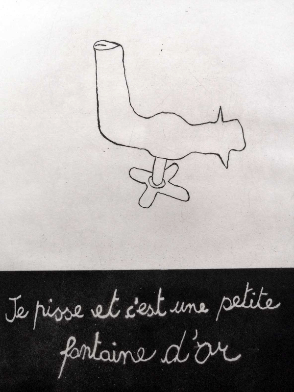 Permette di tracciare un disegno libero e spontaneo. Per definire le campiture, l’artista ha steso con un pennello sulla matrice uno strato viscoso di acqua zuccherata unita a un inchiostro di china e, dopo l'asciugatura, ha applicato una vernice di protezione su tutta la superficie. Immergendo la lastra in acqua calda lo zucchero si è sciolto, scoprendo nuovamente le aree dipinte, su cui si è poi potuto procedere con l’acquatinta. L’effetto visivo d’idrorepellenza del segno è dato dalla reazione chimica del contatto tra sostanza zuccherina con la superficie della lastra non perfettamente sgrassata.