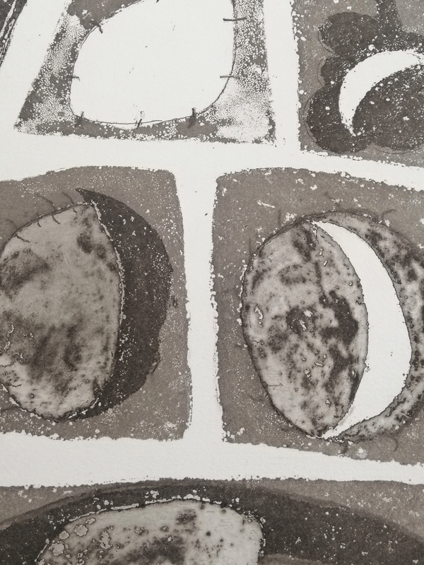 Il carborundum è una soluzione tecnica utilizzata negli anni sessanta da Henri Goetz. Si mescola con una vernice-collante la polvere di carborundum e si stende con il pennello o con la spatola sulla lastra. L’indurimento della pasta permette l’inchiostratura e la stampa al torchio. L’artista ha sostituito alla vernice, il Modeling Paste, una pasta modellante a base acrilica che, utilizzata pura o mescolata al Carborundum crea superfici più o meno porose. Una soluzione che in stampa restituisce molteplici variazioni materico – tonali.
