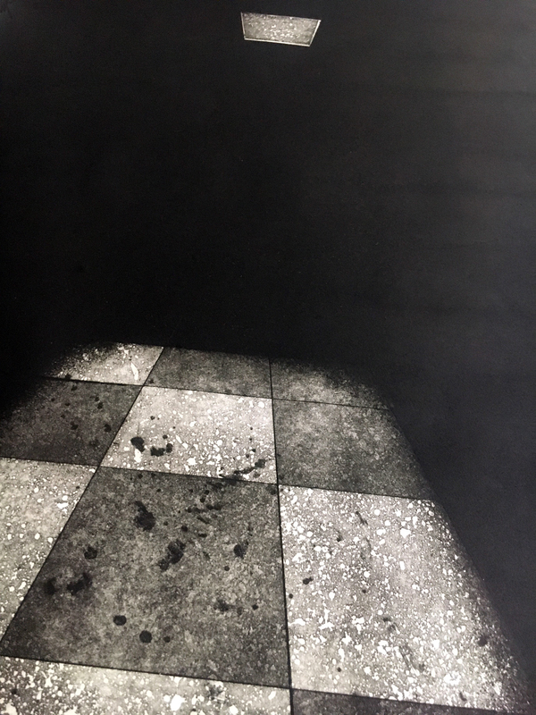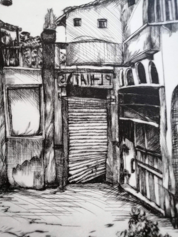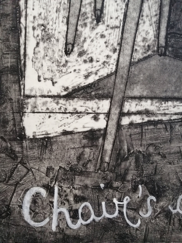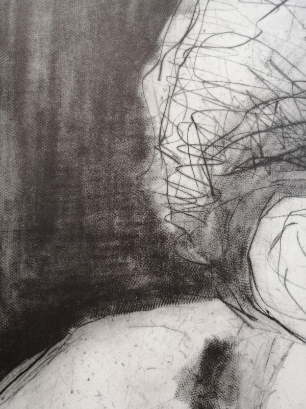 Il risultato in stampa è grafico, molto nitido e il contrasto tra lo sfondo bianco e il segno sfumato tipico della puntasecca è amplificato dal tipo di pulitura: a carta. Pulire il plexiglass richiede un'attenzione diversa da quella utilizzata per il metallo, perchè il controllo visivo, in particolare, risulta più complicato a causa della trasparenza della matrice.