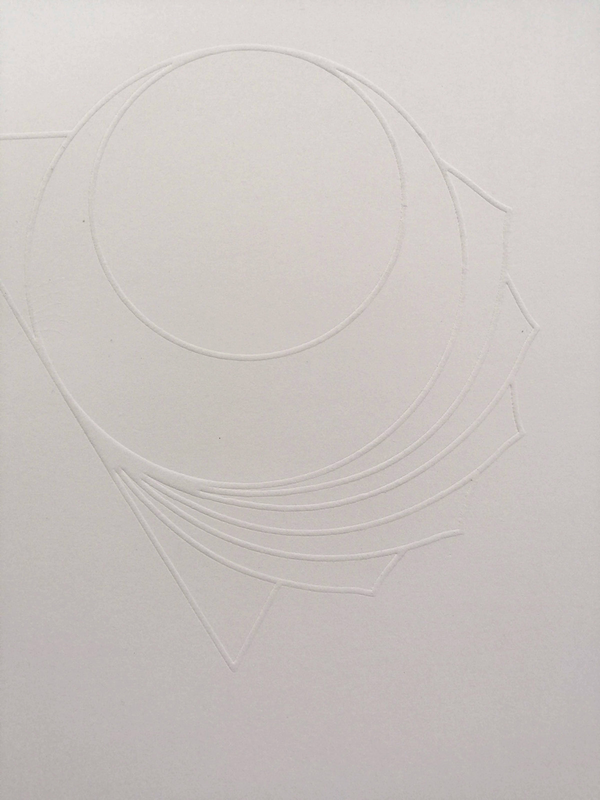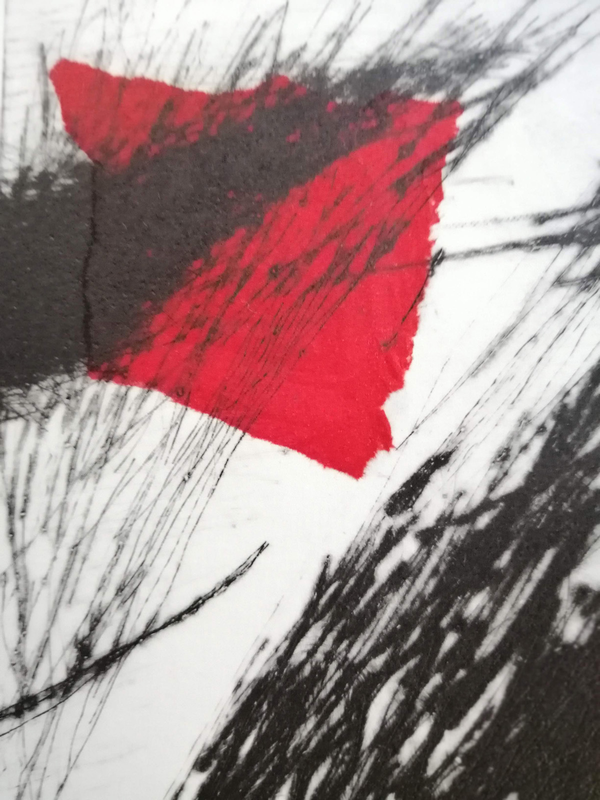 L’alluminio è un metallo duttile, si può incidere direttamente con una punta e ottenere solchi molto profondi con grosse barbe. Il risultato visivo è molto deciso e ha effetto particolarmente tridimensionale. Allo stesso tempo, a differenza di altri metalli, per la sua morbidezza registra qualsiasi lieve graffio, impossibile da eliminare una volta che il materiale è stato intaccato. Nel caso specifico alla pulitura a carta della matrice sono stati aggiunti in fase di stampa alcuni inserti colorati di carte molto sottili in chine-collé.
