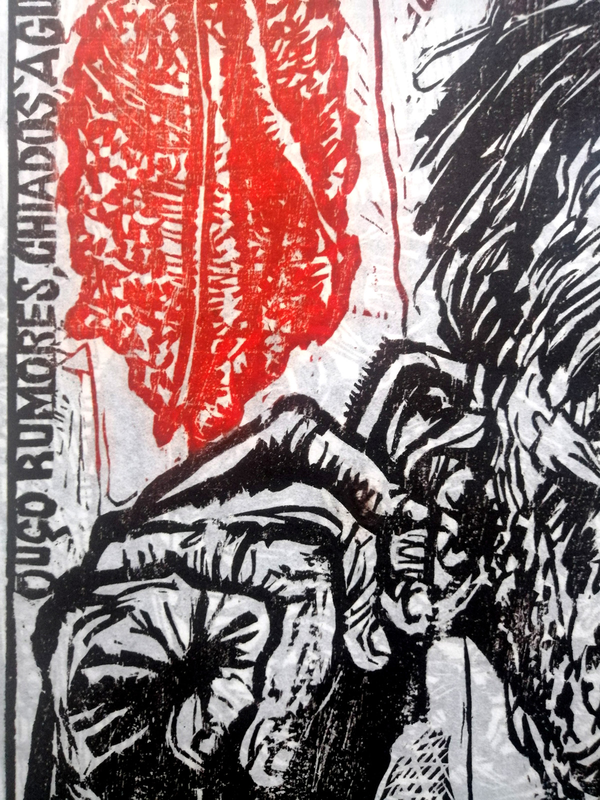 Incidere attraverso la luce. E’ quello che accade utilizzando matrici polimere fotosensibili. Nel caso specifico l’artista ha realizzato su carta un disegno a china con pennino e pennello, lo ha scansionato e riportato su pellicola trasparente. Con un bromografo a luce ultravioletta ha posato la pellicola sulla superficie fotosensibile, ottenendo così il fissaggio di alcune parti del polimero. L’azione della luce ha prodotto dei micro solchi, un risultato del tutto simile all’azione dell’acido. Infine con procedimento in stampa à la poupée ha ottenuto un’immagine con sfumature delicate di diversi colori.