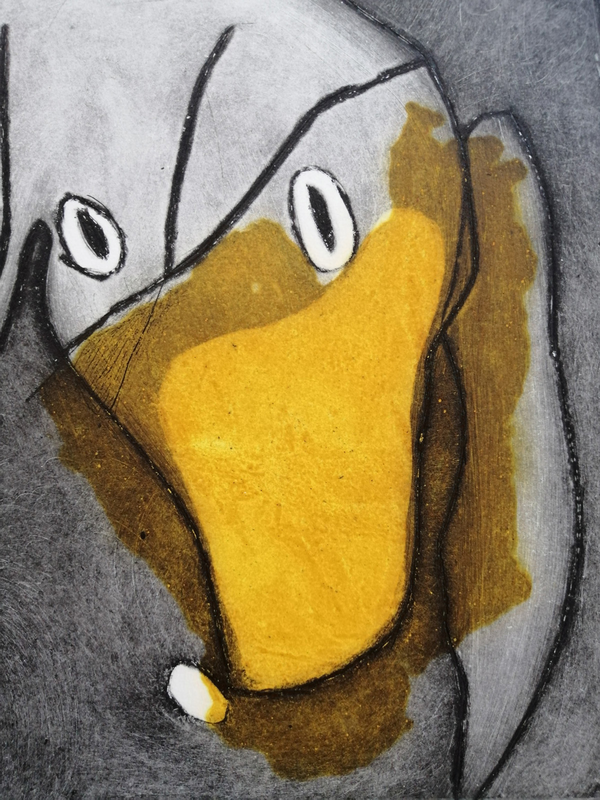 Quando si parla di Monotipia si fa riferimento al concetto di unicità, dal greco "unica impronta". Il Monotipo è il risultato in stampa di una matrice non incisa, ma usata come supporto su cui stendere l’inchiostro, in genere a pennello o a rullo. Il passaggio sotto il torchio riporta su carta, infatti, l’impronta dell’immagine appena dipinta. Con uno strato sottilissimo di inchiostro è possibile rispettare la fedeltà dell’immagine senza incorrere in risultati imprevedibili dati dallo spostamento anomalo dell’inchiostro. Dal dettaglio si capisce come l’artista abbia prima rullato su tutta la superficie con un unico colore e poi dipinto con il nero.