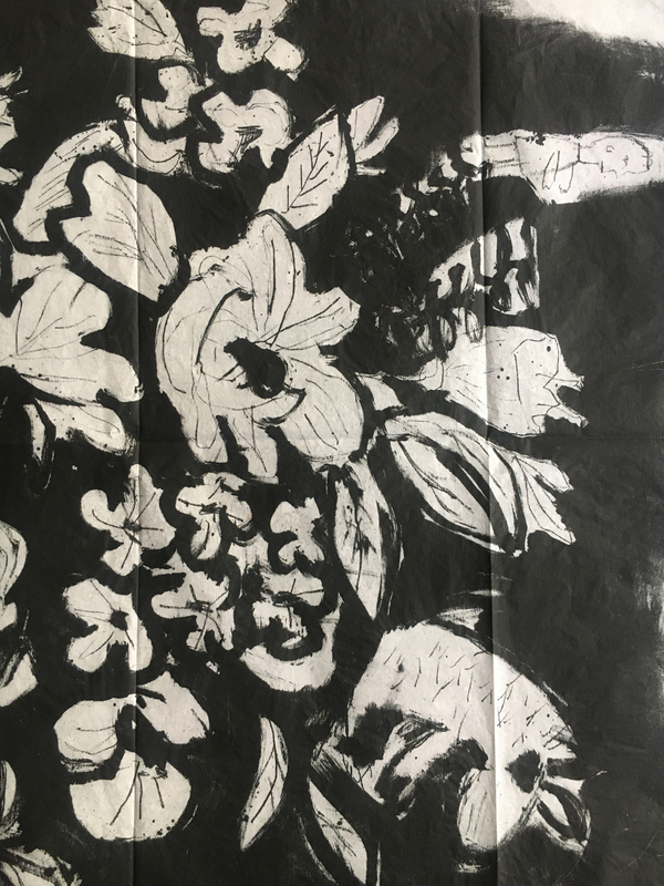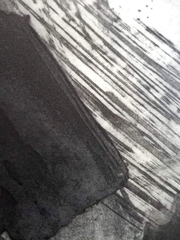 Quando si lavora in monotipia non sempre si riesce ad avere un controllo totale della materia. In base alla quantità d’inchiostro stesa sul supporto e alla pressione durante il passaggio sotto il torchio spesso accadono degli imprevisti. Se si procede per gradi, come in questo caso, l’incidente non è più necessariamente visto come un errore. Se controllato e reintegrato secondo la composizione, può essere un’opportunità di riflessione e parte del processo di lavorazione.