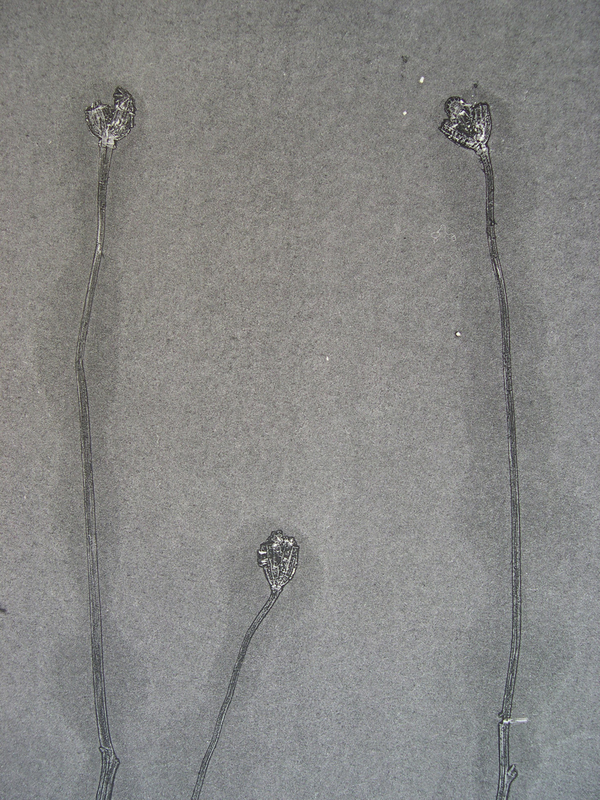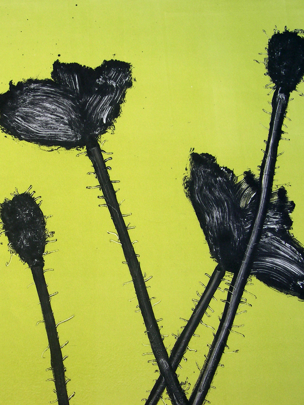I fotopolimeri sono materiali plastici idrosolubili e sensibili ai raggi ultravioletti contenuti nello spettro elettromagnetico della luce solare o in particolari strumenti chiamati bromografi dotati di lampade a radiazione ultravioletta. L’esposizione della lastra alla luce del sole o della lampada, per il tempo necessario, fa sì che il polimero che la ricopre si indurisca in modo definitivo non risultando più solubile in acqua. E’ una tecnica indiretta che permette di avere una libertà estrema nella manipolazione della propria immagine. L’artista è partita da un suo disegno a china unendolo con un’elaborazione in Photoshop a un’altra sua fotografia ed è intervenuta sulla pellicola finale prima di posarla sulla matrice in polimero.