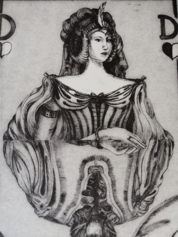 Oltre alla classica punta che permette di tracciare un solco sulla matrice in questo caso l’artista ha utilizzato una o più roulette. La roulette o rotella è una piccola ruota dentellata o puntinata in metallo che contribuisce alla resa di un effetto sgranato. Se l’uso di questo strumento rimane simile al gesto di incidere con una punta, ossia di scalfire direttamente il metallo, l’azione di intaccare con pressioni differenti spazi più ampi della superficie dalla lastra, permette di ottenere vere e proprie campiture incise e di modulare l’intensità dei toni.