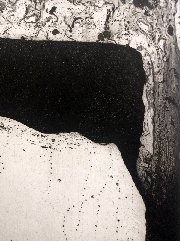 Con un pennello intriso di vernice protettiva è possibile far cadere una certa quantità di liquido sulla superficie della matrice. Sono le zone che nell’immagine si vedono bianche, perché coperte sino all’ultima fase di lavorazione. Il resto del metallo è stato invece intaccato dall’acido procedendo di volta in volta con le aree di protezione. Il risultato gioca sulla composizione: la pennellata bianca in primo piano è nitida grazie alla presenza dell’atmosfera pittorica concentrata e al tempo stesso rarefatta del fondo.