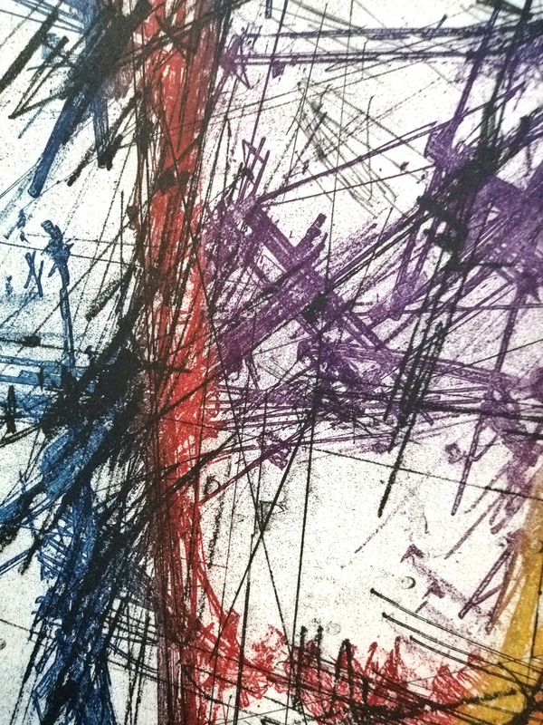 La tecnica della Ceramolle permette di ottenere un segno che rispetta la naturalezza del gesto. Di fatto noi registriamo, fissiamo fisicamente, un movimento e una determinata pressione che diventerà la nostra immagine. In questo caso l’artista ha usato alcune matite e il retro del pennello per intervenire su due matrici, una per il nero e l’altra per il colore. Il procedimento à la poupée in fase di inchiostrazione permette di inserire più colori sulla stessa matrice. La stampa in doppia battuta a registro unisce e fonde i due livelli.
