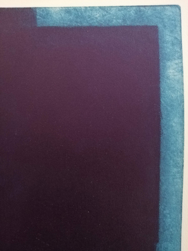 Applicare il metodo tradizionale dell’acquatinta significa dover circoscrivere e isolare con una vernice di protezione l’area che si desidera incidere, è quello che l’artista ha fatto in questo caso prima di polverizzare e fissare il bitume giudaico per poi immergere la matrice in acido. Il colore è stato concepito su due livelli, dunque su due matrici: una per i bruni e l’altra per i blu. Le diverse tonalità di colore sono ottenute grazie all’incisione con più tempi di acidatura e differenti polverizzazioni di bitume.